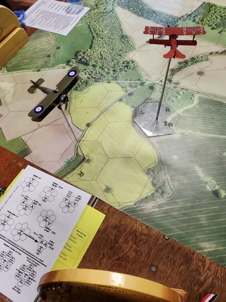 I got to play in an Aerodrome 1/72 scale WWI airplane dogfight. Here my Fokker D VII has a pesky Sopwith Snipe buzzing around it.